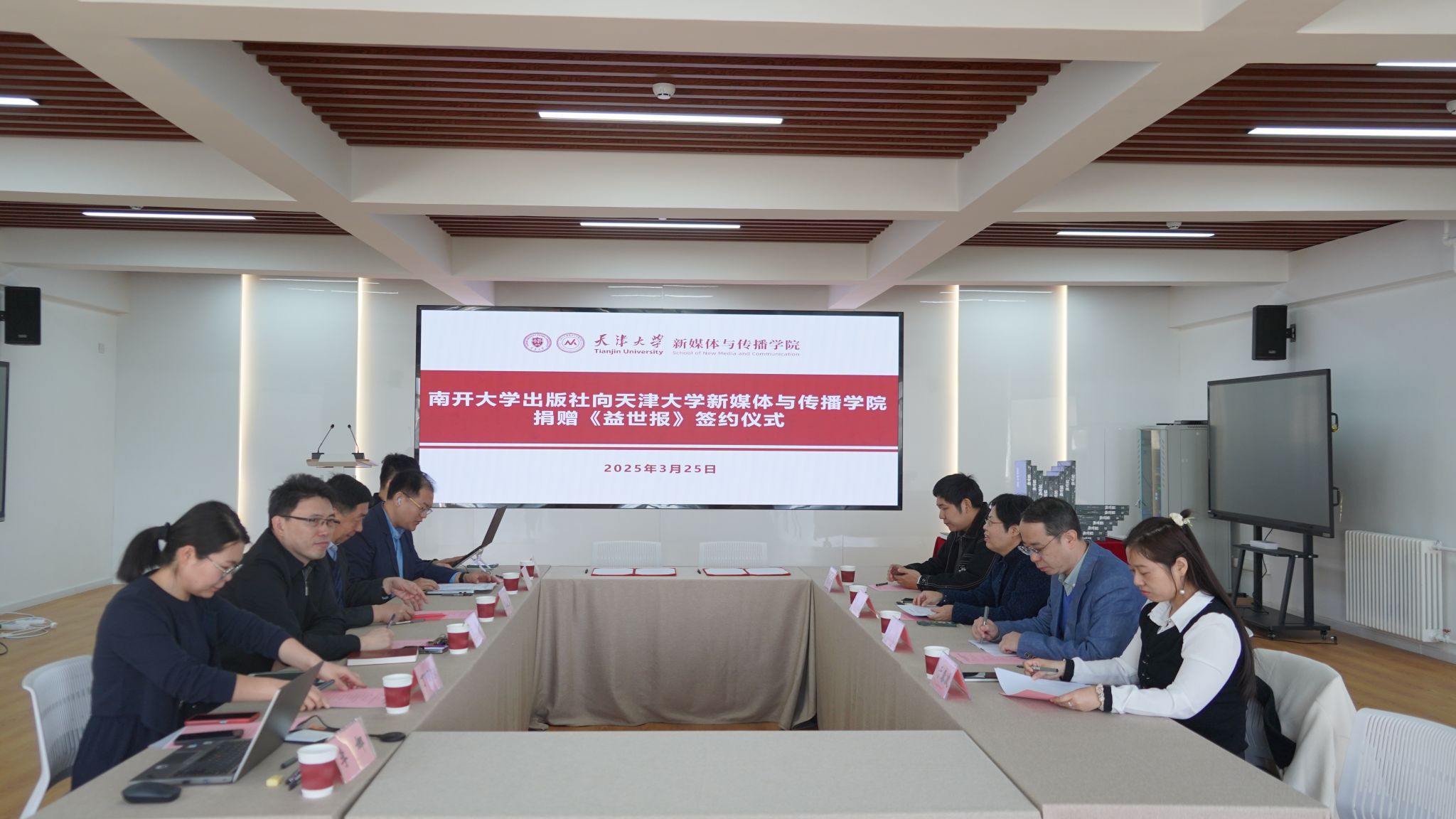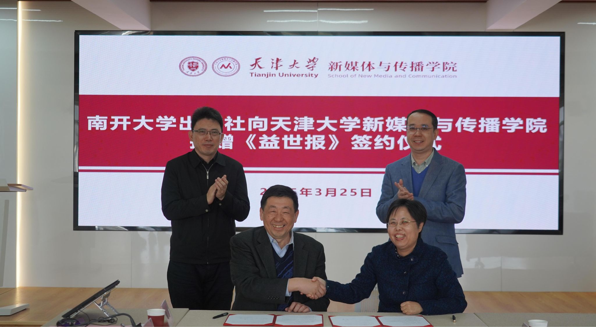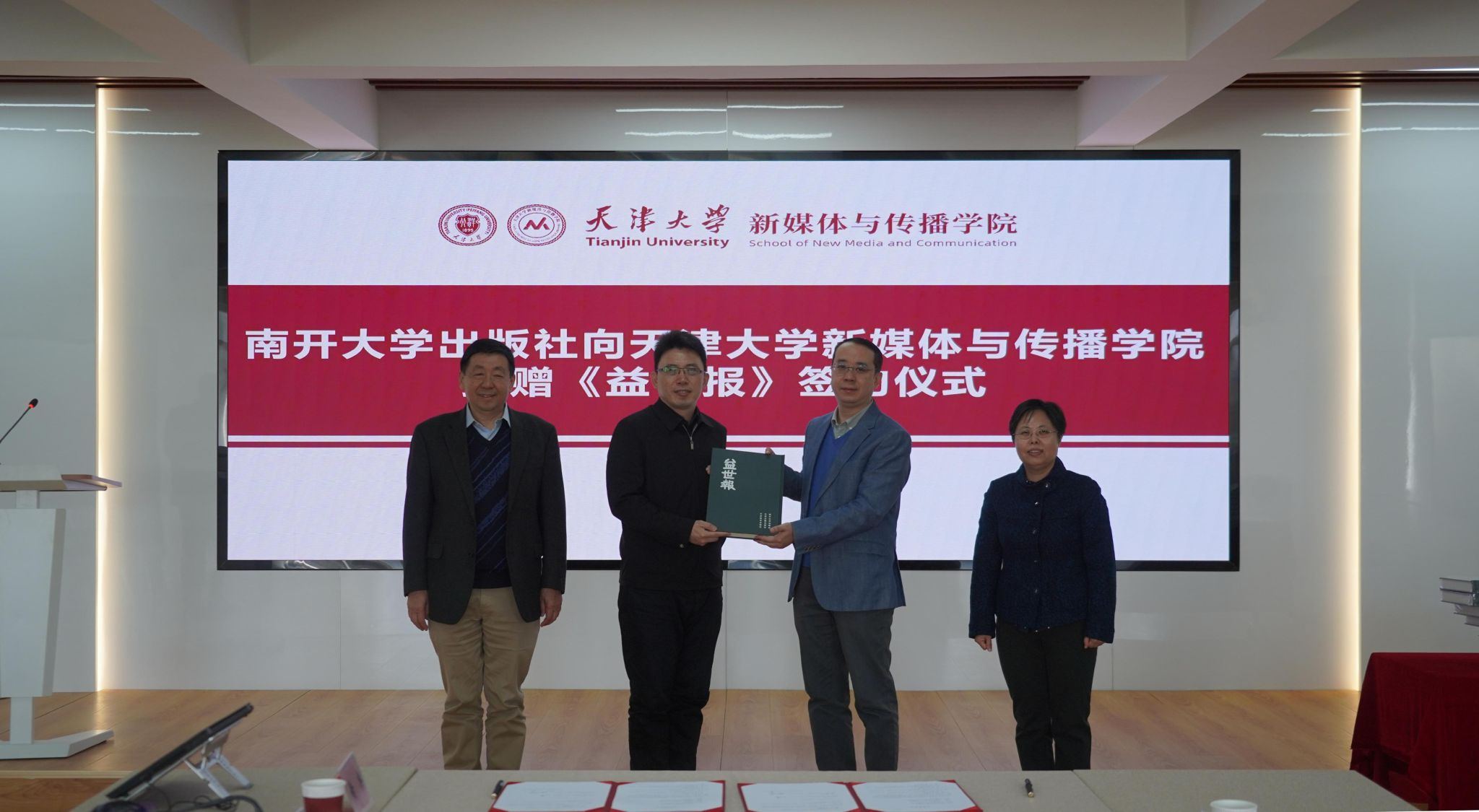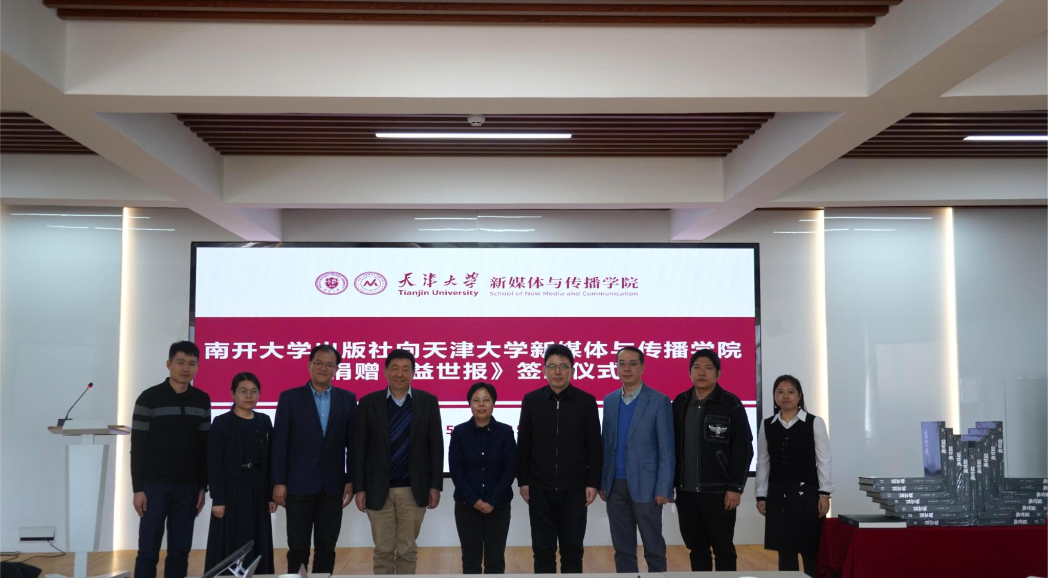 (通讯员 李娜)3月25日,南开大学出版社有限公司与视色 共同举办图书捐赠仪式。仪式上,南开大学出版社向视色 捐赠《益世报》影印本(全136册),为学院的教学与科研工作注入了新的活力。南开大学出版社社长王康、副社长张玮、编辑室负责人李骏、策划编辑于春波,视色 院长陆小华、党委书记王赞、副院长刘彧、副教授丁丽琼、办公室主任黄典等参加活动。